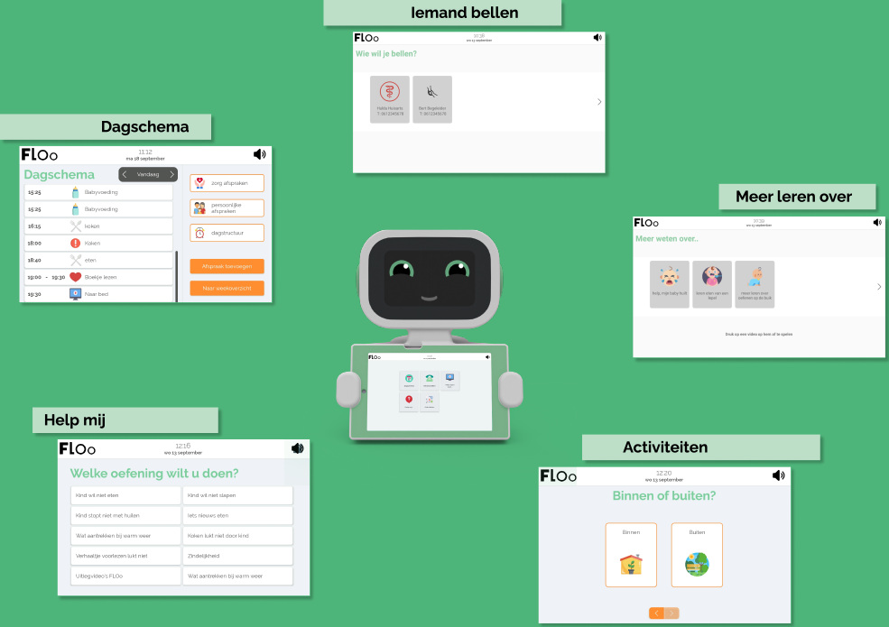 FLOo hoeft niet te slapen en is daardoor altijd bereikbaar. Fijn, omdat we weten dat ouders juist ook op tijden dat hulpverleners niet bereikbaar zijn, kleine vragen kunnen hebben of herinnerd moeten worden aan hun dagelijkse routine.